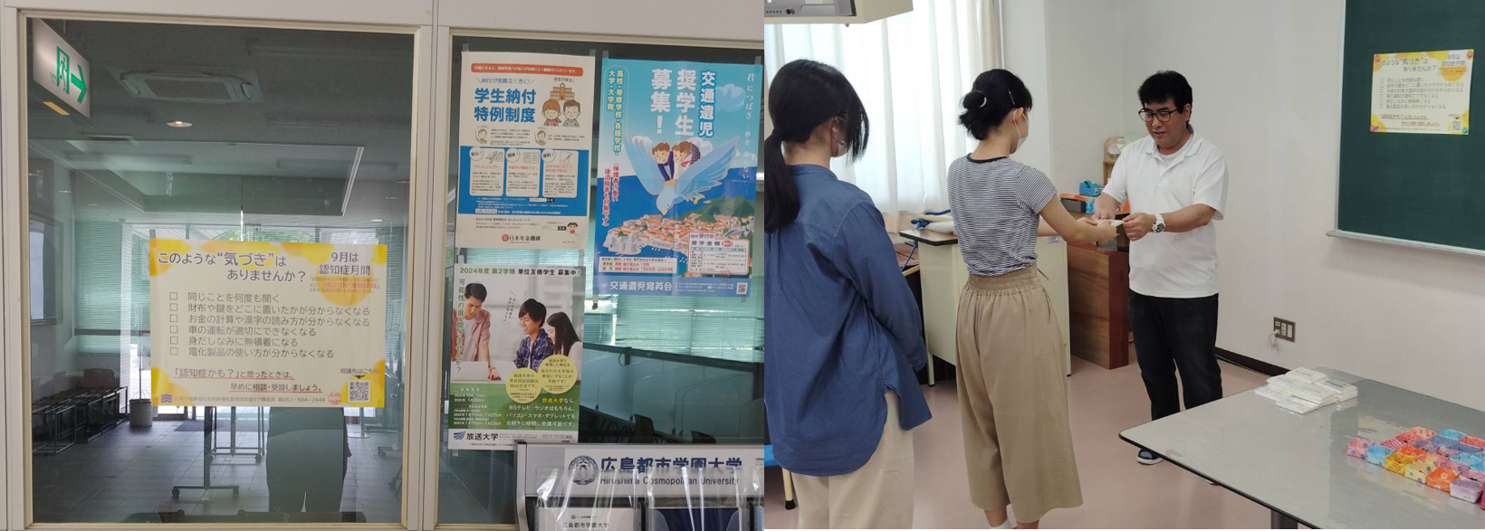 当大学では、広島市と連携し、学内にポスター掲示、及び学生には認知症について説明したうえでポケットティッシュの配布を行いました。